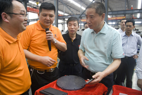在参观车间的过程中,澳门新莆京在线董事长苏亚帅向辛国斌副部长一行介绍了公司的发展方向、产品技术、自主研发能力及产品的应用领域和发展现状,详细汇报了公司近年来加快向“智能一代”迈进、加快创新技术研发、深化产学研合作、积极承担数控一代龙头企业责任、深入推进“互联网”和“智能制造”方面的新举措。听了苏董的介绍,辛国斌副部长勉励澳门新莆京在线多对标国际先进技术,借鉴成功经验,增加核心竞争力,培育更多有自主知识产权和市场竞争力的产品,探索工业发展创新模式,把推进智能制造作为培育工业增长的新动力及提高生产效率和提升质量的重要举措,努力实现弯道超车。 智能制造示范车间里,拥有自适应能力的智能机器人、智能检测设备以及成熟运用的数字化工厂平台系统吸引了辛国斌副部长一行。他详细询问各个环节的技术关键点,给出指导意见,并鼓励澳门新莆京在线要坚持自主研发,继续创造中国style。辛国斌副部长还仔细了解了澳门新莆京在线采用超声波辅助加工及多种智能传感器结合的新产品——超声波加工中心,并与澳门新莆京在线相关项目的技术专家探讨该设备针对特种材料加工的技术问题,且当场提出很多宝贵的指导意见。 国家工信部副部长辛国斌与澳门新莆京在线相关项目的技术专家探讨关于特种材料加工的技术问题