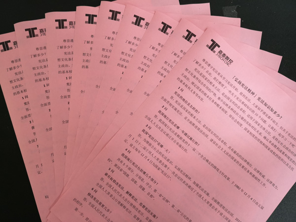 2019年12月4日是第六个国家宪法日,也是第二个“宪法宣传周”。今年的“宪法宣传周”以“弘扬宪法精神,推进国家治理体系和治理能力现代化”为主题,突出学习贯彻党的十九届四中全会精神。为深入学习贯彻落实党的十九届四中全会精神,弘扬宪法精神,维护宪法权威,积极营造学习宣传宪法的浓厚氛围,12 月1 日-7 日,澳门新莆京在线开展了宪法学习的系列活动。 为积极营造宪法学习的良好氛围,澳门新莆京在线在厂区内悬挂宪法宣传标语横幅,向员工发放宪法知识传单,组织观看宪法宣传片,积极传播宪法知识,弘扬宪法精神。宪法是治国安邦的总章程。宪法精神包含改革开放,实事求是,从实际出发的精神。企业学习宪法,既有助于提高依法治企的能力,又能帮助培养“工匠精神”,鼓励员工勇于创新。